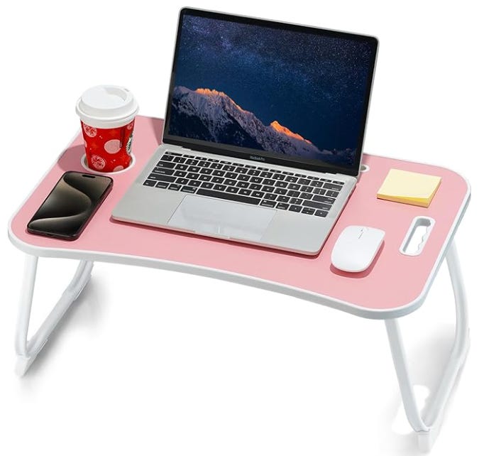 I actually used a different lap table that I had purchased at a craft store, and it didn’t quite hold up. This portable desk was a much better find! Sturdy for anything from eating to laptop browsing, and enough space for crafting if you need to keep your hands and mind busy. The legs fold up for easy and convenient storage.