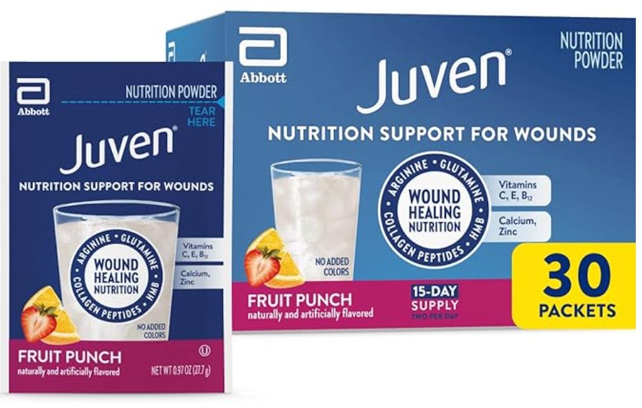 Juven comes highly recommended by many in the medical field. It’s a flavor packet containing amino acids, collagen peptides, vitamins, and zinc that you add to water, intending to support wound healing.
