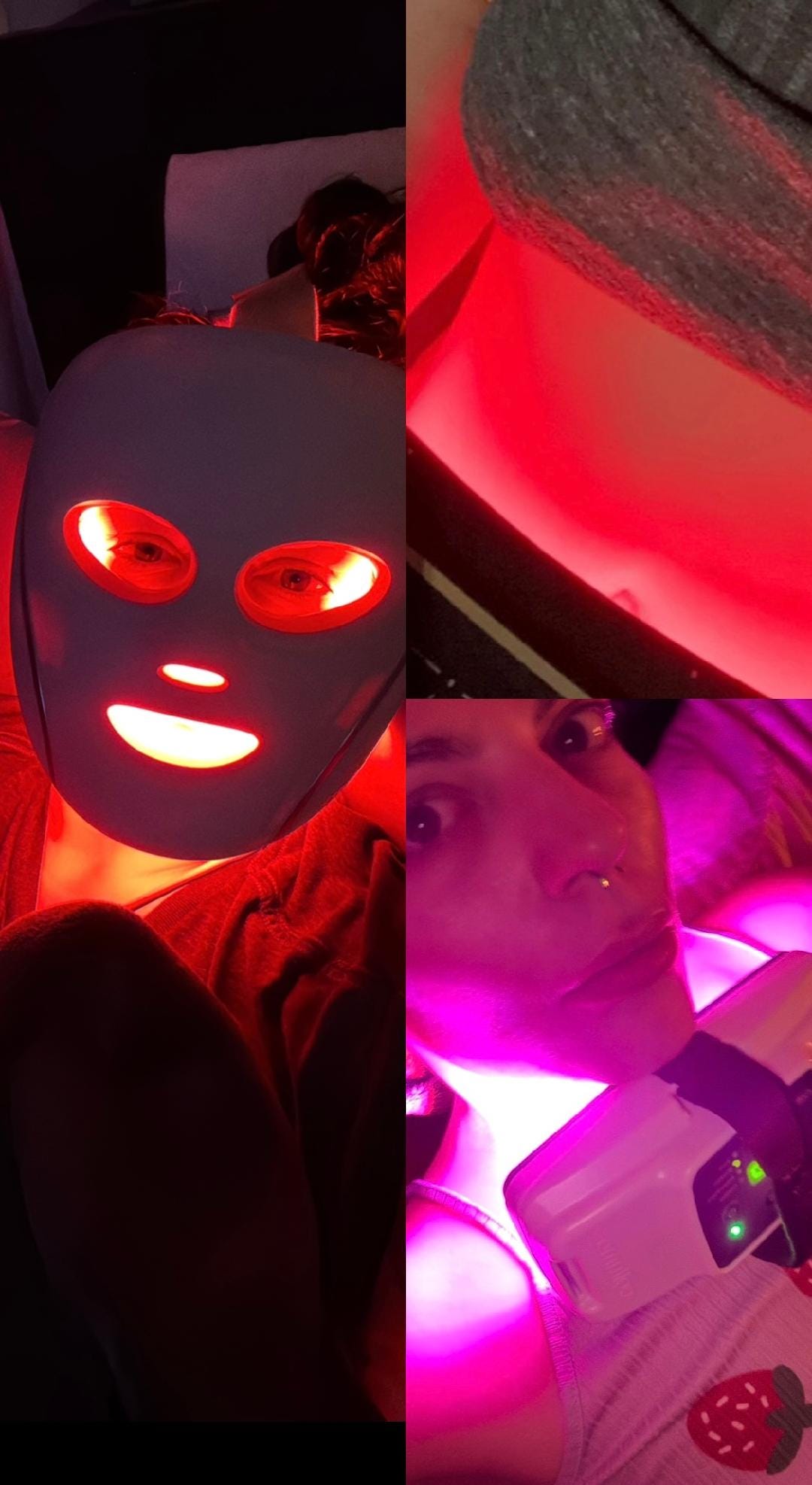 From clockwise: Shark CryoGlow LED Mask, LuxRenew Red Light Panel, and the Celluma POD Handheld Light Therapy.